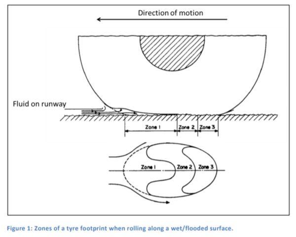 23. I don't know what you saw in training material and I certainly have absolutely no doubts about your sincerity, integrity, skills and professionalism. But you've given me nothing I can examine and I do need something a bit more to go on. I have seen some films of hydroplaning tests that may give that impression due to camera synchronisation artifacts. Tyres I have examined after rubber-reversion hydroplaning have mostly had single contact patch areas of rubber-reversion, in one case they had several, representing multiple events with patchy areas of shallow water and the operation of that anti-skid system. I've never seen any damage that would correspond to slow rotation whether forwards or backwards. Hot steam should not be acting at the front of the contact patch where the water is coming from, that's the cooled side. I've seen DFDR showing wheel rotation ceasing at a point corresponding (but not exactly, the data isn't that accurate) to the white marks of rubber-reversion hydroplaning starting. If your training film *told* you that these were the conditions of rubber-reversion hydroplaning, I can only say, your training film was wrong to do so and you should re-evaluate incorporating this material in your personal model of how things work. But give me some reasonable reference to support your position and I'll be happy to do the same. I completely agree with the technique of a firm landing and avoiding a 'greaser', though more for having the maximum stopping distance. Unless you have solid tyres, it shouldn't be making any difference to whether or not you hydroplane in the first place and won't prevent subsequent hydroplaning. I do not accept the existence of rubber-reversion hydroplaning without prolonged wheel lock. With the improvements to anti-skid systems in the early eighties it is hardly ever seen in large transports today, except with emergency locked wheel braking. I still see no reason to expect fairly high rates of blown tyres with hydroplaning large transports and anti-skid inoperative. But I'm guessing now that you had dry runways in mind. Certainly more than with anti-skid, but I'd expect the thermal fuse to do something most times before the tyre blows. I must confess I once hydroplaned a good two and half km in a lightly loaded condition (150 tonnes) - it was very interesting and quite concerning too - nice that I had more than 3 km available. I'd say the use of reversors with regard to rudder effectiveness would be type specific, but I would note that you are not left without directional control with loss of rudder effectiveness, you have differential reverse thrust available and the issue of prohibited n1/n2 blade flutter zones in reverse is best left for maintenance to deal with after you stop. In some large transports, failing to use reversors means you don't have any lift dumping, which is hardly helpful. Yes, speed, water depth and tyre pressure are considered factors, as well as surface texture. Screed surfaces greatly increase the water depth requirement, but are hardly used due to the stone throwing aspects and so on. Grooving does much the same thing, longitudinal is a hell of a lot smoother than crosswise and more durable. The essence of predicting commencement of total dynamic hydroplaning is Horne's formulae. dynamic hydroplane ground speed (knots) = 9 x tyre pressure (PSI)^-1. Load/weight makes no difference - for a typical F100, it's 146 knots. Robert Horne did about twenty years of experimental research on hydroplaning in the NASA, using full size gear on a test sled. In 1963 he thought the (reverted-rubber) cleaned skid phenomenon was due to water under high hydrodynamic pressures scouring the area, but with more research, came to understanding the steam aspect. Due to improved anti-skid systems, you hardly see it today - except with emergency systems that don't have effective anti-skid or defeat anti-skid. What really happens in rubber-reversion hydroplaning? You have up to three zones involved in hydroplaning. In total dynamic hydroplaning, the entire tyre is removed from contact with the underlying surface - the dynamic hydroplaning zone extends from the area of tyre contact with the water and there is neither a viscous hydroplaning zone nor a zone of surface contact (or a bow wave). In hydroplaning, this zone is always present , but its trailing edge moves forward, first being replaced by the viscous zone, then by the contact zone behind the viscous zone. As speed reduces, the contact zone increases in size, displacing both the viscous and dynamic zones until we have full contact again. Also, as speed decreases below total hydroplaning speed, a bow wave is formed as part of the dynamic hydroplaning zone. drawing: Gerad van Es, Netherlands Aerospace Centre. Zone borders change with conditions. Zones 1&2 reduced in R-R planing. In rubber-reversion, the wheel is locked and the area of the contact zone (the third zone) is heated whilst being supplied with water from the viscous zone, which is turned into steam. This can only - repeat - only - occur with the wheel locked. The reverted rubber tends to form a skirt about the water under the contact zone, retaining water to create steam and reducing friction in much the manner of a hovercraft. The steam is towards the rear of the tyres interaction with the water and the surface, not at the front. There just isn't a way to do it with a rotating tyre, forwards or backwards, because the conditions for it no longer exist - at least, in real aircraft so far. Maybe if you take things vastly outside of real world parameters you might be able to heat the whole tyre whilst it slowly moves in a forward rotation. And maybe you can drive it backwards and have the same thing happen. But that's so far beyond scope it isn't worth looking at. Films of total dynamic hydroplaning tests will often appear to show backwards movements as the wheel slows down to a stop (which it will do, if total dynamic conditions remain lon