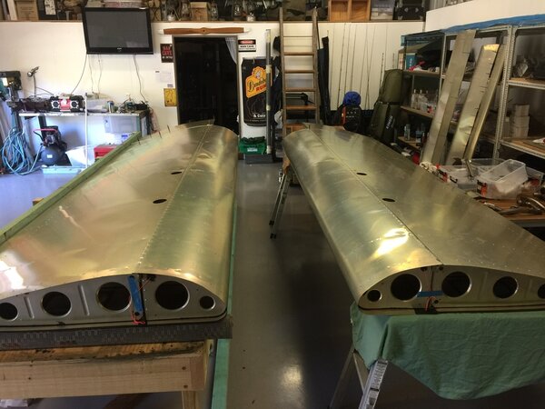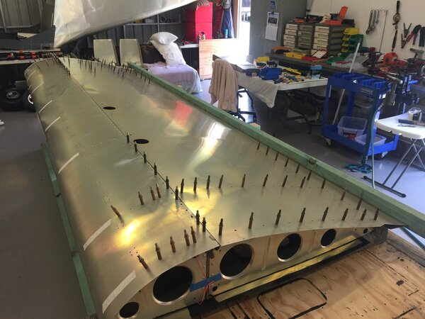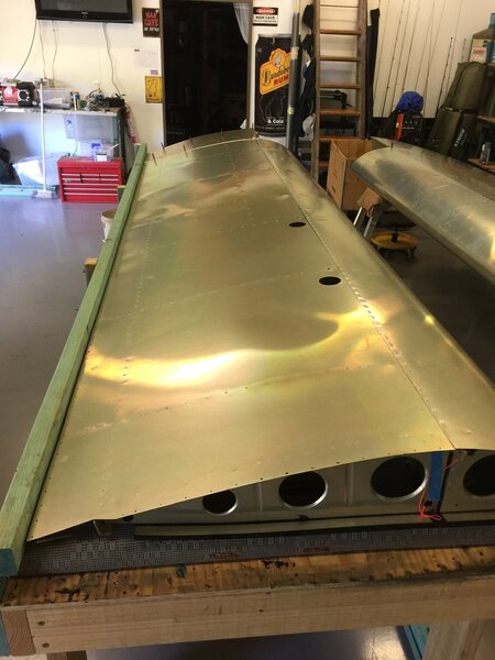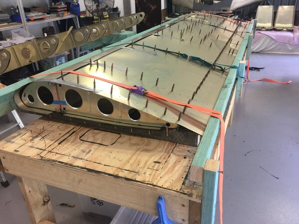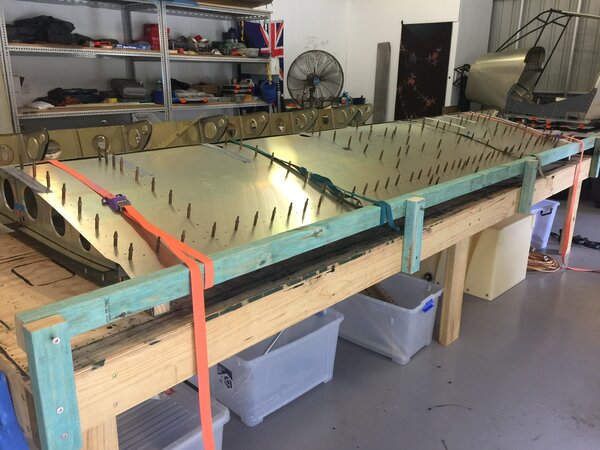 A quick update on my build progress. Have the skins on both wings. Thanks to IBob for the idea of using a fence on the bench and to Bill Grieves for helping me pre bend the D skins. Fuel tanks and plumbing in next. Cheers Phil
