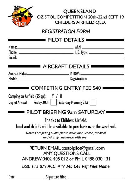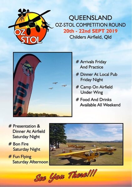 Hi Folks, We are happy to announce the Qld round of the OZ-STOL championships to be held at Childers Airfield on the 20-22nd of September. Entry forms can be found on the Oz-STOL Facebook page. Cheers The Oz-STOL Team