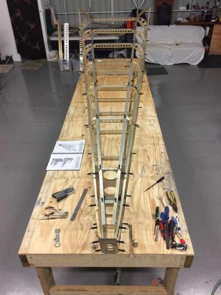 11. A quick update on my build progress. Have the skins on both wings. Thanks to IBob for the idea of using a fence on the bench and to Bill Grieves for helping me pre bend the D skins. Fuel tanks and plumbing in next. Cheers Phil