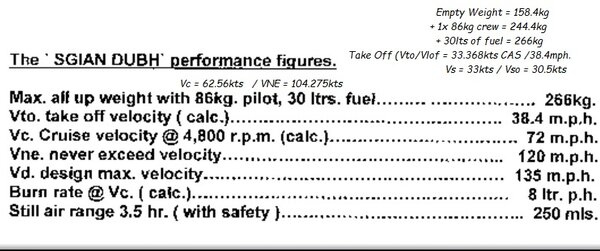 The Sgian Dubh will be having either a Rotax 447 0r Rotax 503 refitted, I am not sure what photos Hugh sent you? if you have them to hand, could you please either send me copies of them via email or copy them onto this site? I am interested to see ;-) With the rotate speed at 38.4mph (33.6kias ) We have calculated the Stall speed as Vso 30.5kias ( it actually will stall at 28.7kias if our calcs were correct as we factored in a 6% buffer in our figures ) Academic anyway as the rotate speed is below the SSDR threshold. My Aerodynamicist team are S#*T HOT on these types of calcs & to be honest between them & Hugh they baffle me ;-) My forte is flying the things & putting these type of aircraft through SSDR. I see getting the Sgian Dubh through SSDR as an achievement, it even ranks higher than me getting an Inflatable RIB with a Flexwing attached through SSDR ( The BMAA & LAA wouldn't accept this under any circumstances prior to SSDR becoming available ). Unfortunately for me, I will in all likelyhood only see the Sgian Dubh FLY from the ground, I exceed the seat limit somewhat ;-) so I have to relinquish the flights to a more svelte pilot within the team ;-)