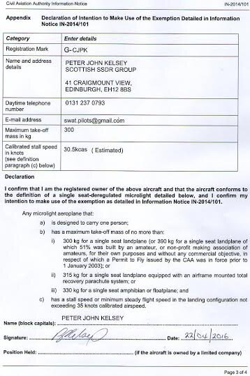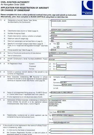 The Link will work as of Monday 25th April 2016. Here is an excerpt from our Now Pro-Active CAA. RE: Registering the Sgian Dubh G-CJPK SGIAN DUBH S/N PJK001 Inbox x RegAircraft 21 Apr (2 days ago) to me Dear Peter, Thank you for your email and CA1 application form. We would be grateful if you could confirm whether you are using your BHPA insurance cover for this aircraft. Also please could you clarify whether you are the owner of the aircraft following being gifted to you by Mr Lorimer as we are unable to register an aircraft to a keeper as this terminology is not used in the registration of aircraft. We can only register to an owner or charterer by demise. If the aircraft has been gifted to you please could you confirm the date on which this occurred. Please could you also arrange for a signed and dated CA1 to be emailed or posted to us with the payment for £68. Alternatively, the payment can be made by telephone. Thank you for your assistance. Best regards Sue Wood Aircraft Registrar Civil Aviation Authority Aircraft Registration CAA House 45-59 Kingsway London WC2B 6TE