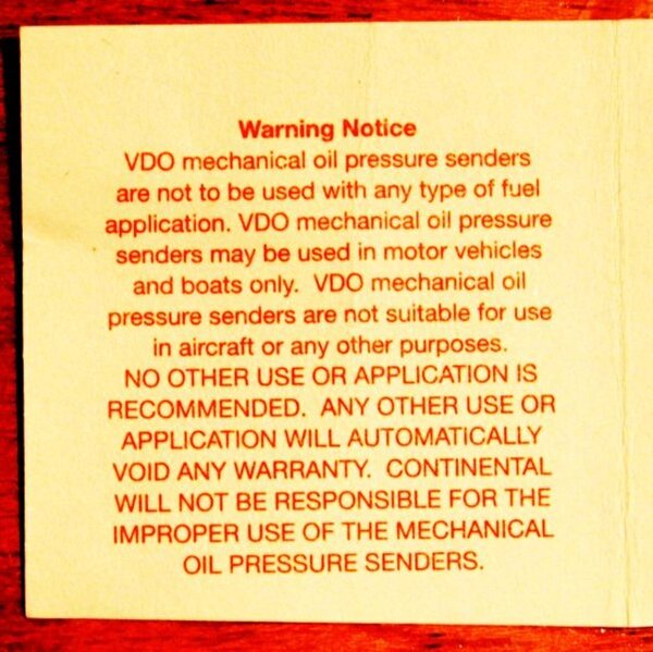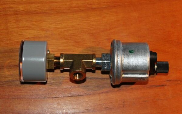 3. Recently my buddy Rex noticed oil pressure fluctuations on his brand new Rotax 912ULS. He has the Grand Rapids Technology EIS and the housing of the oil pressure sender on his new engine is physically different than the VDO I have. However the pipe thread that goes into Rex's oil pump LOOKS the same as mine.... today is the first I'd heard that Rotax had changed this pipe thread. I'm not sure I believe this, in fact. Whatever, I removed the "new style" sender from Rex's brand new 912 and screwed in a small mechanical gauge which is 1/8-27 NPT. Went right in, didn't leak. Also the VDO sender (P/N 360-004) is 1/8-27 NPT, says so right on the package. (I keep a spare on hand, I've had to replace a couple of these already. If you mounted the sender remotely as the instructions tell you to do, rather than screwing it into the oil pump the way Rotax does, the sender might last longer.) Long story short, I attach a photo of the 360-004 sender and the 1/8-27 NPT mechanical gauge screwed into a 1/8-27 NPT tee fitting. Note that this is the exact same mechanical gauge that was temporarily installed in the new 912ULS, and the VDO sender is an exact replacement for the one in my 2006 912ULS. From all the above, I conclude the female thread on the Rotax 912 oil pump, old (my 2006) or new, is 1/8-27 NPT. Take it for what it's worth. BTW, VDO is very adamant that the 360-004 IS NOT FOR AIRCRAFT APPLICATIONS. Good old Rotax.