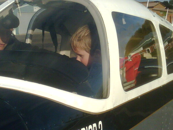 A bit of background: When we moved (for me, back to) Melbourne in 2003, I was effectively grounded as it was an expensive place to live on one salary and, well, my partner isn't too keen on any form of flying, anyway. So, to keep entertained, I would "play" MS flight simulator and more often than not fly the default Mooney. My son, around 9 months old would watch me, and maybe at 18 months was flying himself (and not doing a bad job). On my 40th birthday, we went to Tocumwal for the weekend to celebrate, staying at the Coachmans Cottages (I think they have changed now). I managed to convince my partner to let me go for a "joyflight" so I took my son to John Williams aviation, which I knew had a couple of Mooneys. Upon entering the hangar, John and I introduced ourselves and my son instantly recognised his fleet, pointed to them and proclaimed, "Mooney". John was a little stunned by it and complimented him on his aircraft knowledge. Fast forward to October 24, 2010, and my son had just turned 8 years old. We moved back to the UK in 2006. I have yet to get back into flying, but am still "playing" with MS FSX, as his he. He is a prickly and stubborn so-and-so and was getting on my nerves a bit; so my partner suggests I take him away for an overnighter, I book some hotel somewhere for the next weekend and warn him that bad behaviour will result in it being cancelled. By Wednesday, we cancelled it. A couple of weeks later, he has a week of reasonably good behaviour, so on the Saturday morning, I jump onto one of those last minute booking sites and score a night at the Crown Plaza, Marlow Bottom for about £50. Fantastic.. So we hurriedly pack and off we go. The next morning, we awoke to a cold, but crisp and gin clear British winter's day. We hop into the car, but being a Sunday in a semi-rural area, there is not much happening. We found a park and had a kick of football (soccer) and then when bored of that, I thought, Wycombe Air Park (Booker) is not too far from here, so rang the missus to ask her if she would mind if we went for a joyflight. She was very hesitant (as she still thinks those tiny aircraft just randomly fall from the sky), but I reassured her that the flying school there was only until very recently British Airways Flying Club, had superbly maintained aircraft and the instructors were second to none. She agreed, so son and I drove to the aerodrome. Thanks to the relatively new EASA and its regulatory fight to put private GA out of business, flying schools could no longer give joyflights on their approvals (they basically needed a full charter service AOC); I didn't know this and when I asked if we could book joyflight, I got a very stern look from behind the desk and was told in no uncertain terms they don't do them anymore. When I inquired why, the response was given but I was offered as an alternative a trial instructional flight. We looked up the booking sheet and there was a slot available at 4pm. It was 11am now. Darn it, 5 hours to wait, but as I still hadn't returned to flying, I was prepared to wait it out. After driving around, singing silly lyrics to the tune of a well known TV commercial at the time, interrupted by a fine roadside services lunch of McChucks or some such similar cuisine, we drove back to Booker a little early with the idea of stopping the cafe overlooking the grass runway where gliding takes place. The cafe was closed, so we whiled away our time looking at the aircraft arriving and taking off. With about 15 mins to go before our slot, we walked in and started the process. We were assigned an instructor and after introductions, he guessed correctly who the student pilot was. It was quite funny, because he literally raided the every cushion from the two sofas and a desk chair. Armed with them, a clipboard, map and headsets, he looked a sight with all his accroutments wanting to egress from his clutches as we walked across the apron to the PA28, refusing my offer of assistance. He placed 3 of the large cushions under my son and two behind his back and asked an instructor returning from another lesson to take the excess baggage back to the club house. The instructor and my son pre-flighted the exterior of the plane and then the interior. The instructor went through everything and my son absorbed it all. Then the instructor fiiddled around, but finally got my son to a point where he could reach the control column comfortably, but his legs dangled and could not reach the rudder pedals: I hopped into the back (yuk!) and the preflight commenced. Soon we were taxying for 24L, which is grass. Remeber, my son is 8 years old and during the taxi, he asks if he can take off. I thought to interject to make it easy on the instructor to say no, but before I could make a decision, the instructor calmly says, "Yes.. I will operate the rudder - you can do everything else.. By the way, what are you going to do?" I was gobsmacked. The boy not only went through the throttling up and at 55kts, raising the nose, but also answered he would check the airspeed is alive and the DG is pointing in the runway direction. "Very well, let's see how you do!" Lined up and with clearance to take off, it was the first time ever, I thought of really asking the ol' fella upstairs to have mercy on us. But the little fella, with his right hand, nurtured the throttle towards the firewall, checked the DG and called airspeed alive. At precisely 55kts he pulled back on the control column and the PA28 almost rivaled an F/A 18 pointing towards the sky. "Maybe not so enthusiastically" said the instructor as he nudged the control column forward a little and called my son having back control. Darn it, he was showing me up! He was bang on 79kts and a little over 550fpm climb and I am sure the centreline was in line with his rear-end. Well, the instructor gave my son instructions, and he dutifly carried them out. turns, ascents, descents etc. He was pretty good and held altitude and heading better than