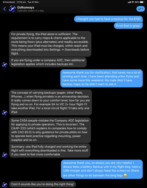 This is not correct for Private Ops. The use of EFB does not require a second iPad / Device or Paper so long as you satisfy the use of it: I do always carry a second device (just in case) all loaded up as well as extra external battery however this does satisfy the requirements. -