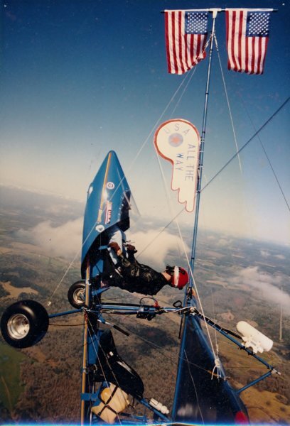 Anybody ever do something like this? Did it about '92 when I was a young whippersnapper! I'd do it today if I could find a pole that long. This is as close to vertical I ever got it. At 85 mph the contraption was trying to tear itself loose. I tail slid one day, flags flew back'erds, lost photo. So what do you guys call it? 1) Crazy 2) Stupid 3) Bad example 4) Super Patriot 5) Nutso