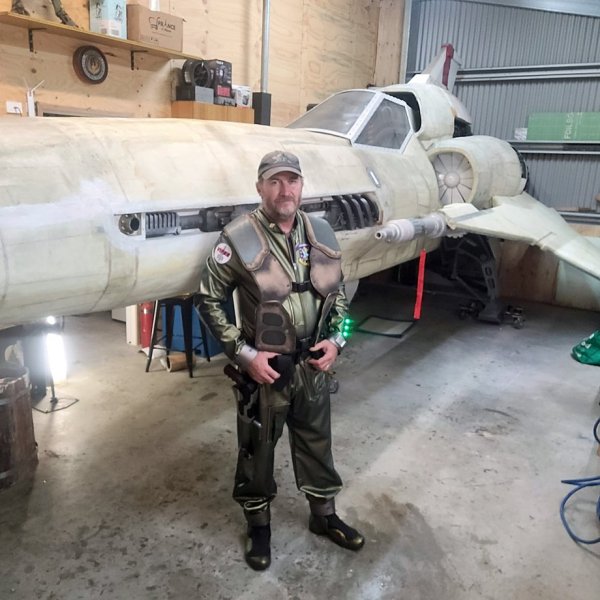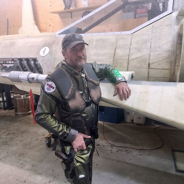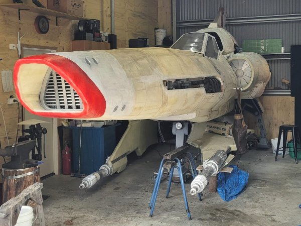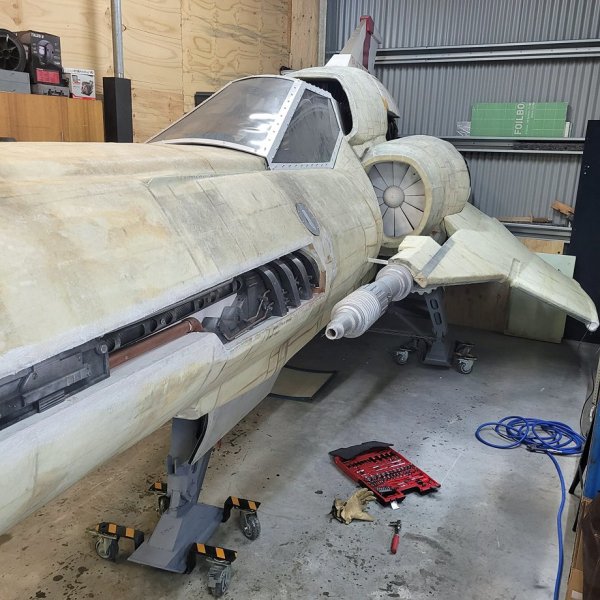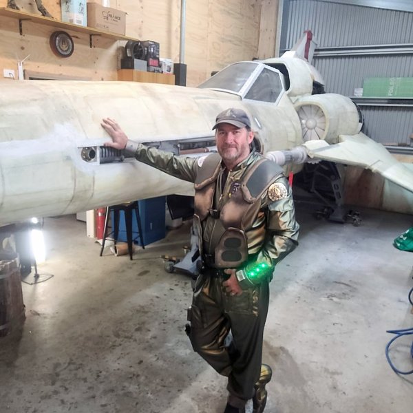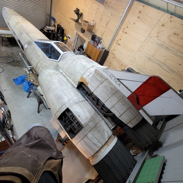Started sanding the fibreglass. Port wing back on so I can do this as well as start hooking up the nav light electrics. The flight suit is all but finished. I brought it all home to put on the last couple of bits of the ensemble and to look for anything that needs adjusting. The pre-flight check list pocket somehow snuck up the leg too far and we didn't notice it until it was all on. I'll have to unpick it and move it down the leg so it's readable in the sitting position in the cockpit. My friend and tailor, Alistair, who has previously worked in the costume departments of quite a few blockbuster movies and TV series, was the man who did all the sewing machine work. I have him to thank for his patience and expertise. I just provided material, consultation and reference, plus a little bit of grunt work when it came to cutting, glueing and sourcing accessories. Sometimes I cringe at cosplay, especially when a grown adult is playing fantasy dress-ups. I have to remind myself that it's an art-form, requiring a mature approach, patience and skill, to achieve something special. The Viper itself has taught me so much and though I can't use a sewing machine, the opportunity to see what goes into a costume for a movie, was eye-opening.