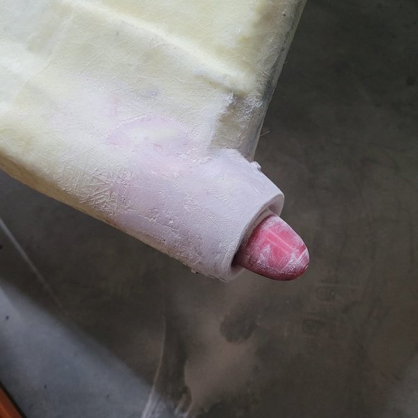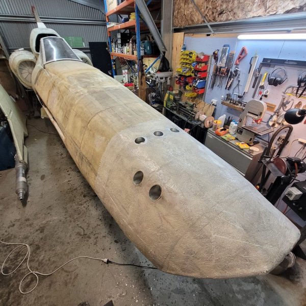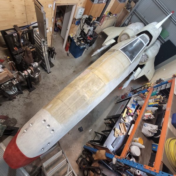 While I'm waiting to sell another blade so I can afford the resin to finish the hull - Did a bit of bog work to tidy the ends of the nav light housing. Ran power to nav lights on the port wing and the strobe on the tail. Re-organised the workshop so I can fit both wings on at once. Yes, they are removable so I can get the Viper out of the shed. (I can't believe the amount of people who ask, like I never thought of that.)