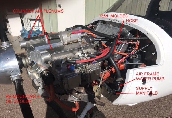 Water temp in cruise at 7500’ with 85df oat is now about 200df. My primary problem was the oil temperature which was up to about 235 in climb, 220 in cruise. It is now a comfortable 195 in cruise after relocating the oil cooler and baffling the engine sump fins. Water temp is about 230 in prolonged wot climb. CHT is about 310 in climb. When I get more time on a stable configuration I’ll finish an article I am writing about the conversion. All of my cooling air inlets are currently crude sheet metal. I’m now finished with the mechanical installation and ready to begin extensive fiberglass work.