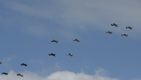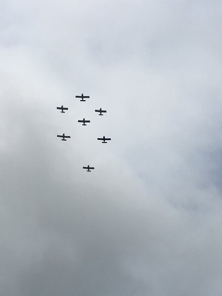 It was a very much muted AD here in Albany. The state has been divided into regions and travel between is only permitted by permit. The Great Southern is 2 away from Perth, and so several of our usual formation members were grounded in Jandakot. Several of our own members had aircraft in maintenance, (in expectation of a complete grounding of all GA), and a couple had escaped out to their farms. So, we ran a mixed type formation, which required some real effort on the part of our faster members: as it did for the tail-ender with only 160HP because we were at 140KIAS. There was no RAAF formation, so we were tasked with the 1100 flypast of the Memorial, (to break the 1 minute silence). There was no marchpast. However the main drag was filled with cars, and a lot of pedestrians who had fore-knowledge of the small RSL event. We made it over the 'top' with 20secs to go, not too bad, considering the many showers and the wind at the time. #1 (leader) RV9A VH-VFE 180HP/FP #2 Falco VH-YBN 180HP/CS #3 Glasair III VH-DNJ 300HP/CS #4 RV6 VH-VNE 180HP/CS #5 RV9A VH-LPL 160HP/FP (Albany Aero Club)