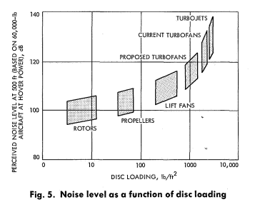 I think @skippydiesel was referring to tips going supersonic noise, rather than them failing mechanically. I too thought ducted fans could be made quieter than a prop, but according NASA JPL Tech-Report 32-7462" A Review of Aerodynamic Noise From Propellers,Rotors, and Lift Fans" by Jack E. Marte 1970 so you are correct! source: JPL TechReport 32-7462 The difference is not great, and I suspect the 'higher frequencies' from ducted fans may be easier to exclude from a cockpit. I suspect reduction in tip noise is less than jet turbulence noise increase, so maybe a wavy exit nozzle as appears on some modern Turbo jets may help. Does anyone have first hand knowledge? I only know my RC electric 'jet' whines, unlike my RC electric prop aircraft.